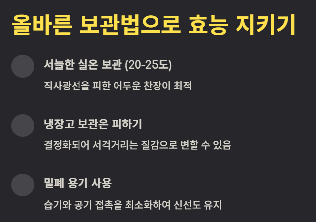 - 보관 방법: 직사광선을 피해 **서늘하고 건조한 실온(20~25도)**에 보관하는 것이 가장 좋습니다.