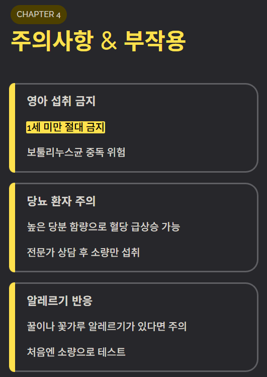 - 영아 섭취 금지: 1세 미만의 영아는 보툴리누스균 중독 위험이 있어 절대로 먹여서는 안 됩니다.
