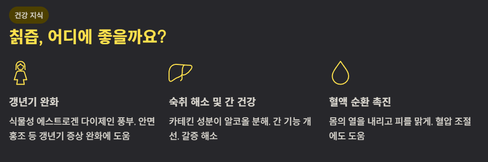 - 효능: 갱년기 증상 완화, 숙취 해소, 혈액 순환에 탁월하며 에스트로겐이 풍부합니다.