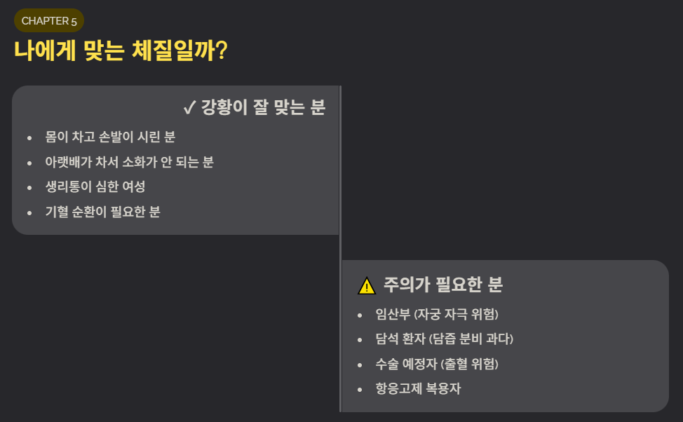 - 체질: 몸이 차고 소화력이 약한 분에게 잘 맞지만, 임산부나 담석 환자는 주의해야 합니다.