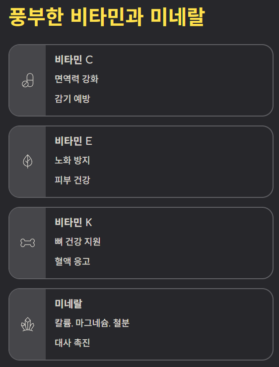 비타민 수준 또한 매우 훌륭합니다. 우리 몸의 면역력을 돕는 비타민 C, 노화 방지에 좋은 비타민 E, 그리고 뼈 건강을 돕는 비타민 K가 골고루 들어있습니다.