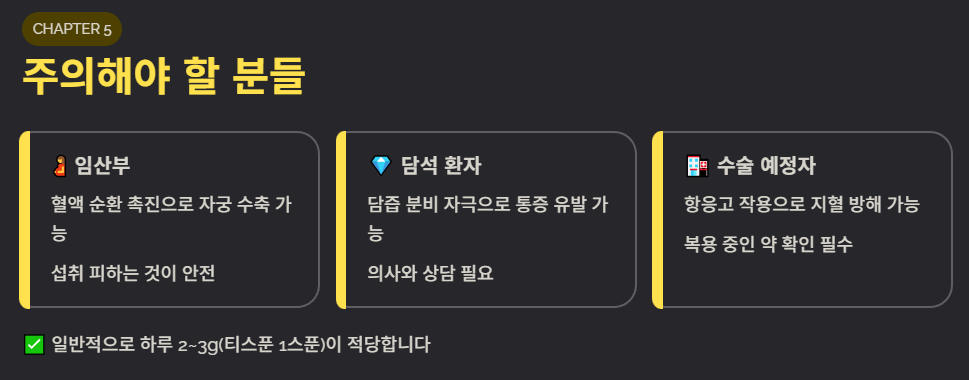 셋째, 수술을 앞두고 있거나 항응고제를 복용 중인 분들은 지혈을 방해할 수 있으므로 전문가와 상의 후 섭취해야 합니다.
