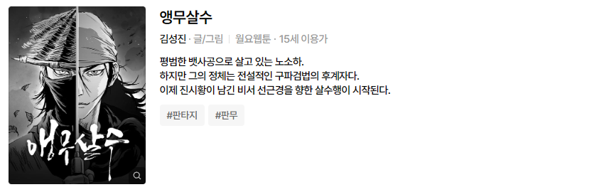 무협 웬툰(만화)는 언제나 인기있는 소재이다. 과거 열혈강호에서 부터, 붉은매와 함께 고수의 전편인 용비불패에 이어 최근에는 화산귀환, 아비무쌍 등 다양한 소재의 무협웹툰이 인기를 이룬다. 그런 가운데 네이버 웹툰 "고수" 와 같은 몰입도와 액션을 또 한번 느끼고 싶다면 "앵무살수" 웹툰을 추천한다.