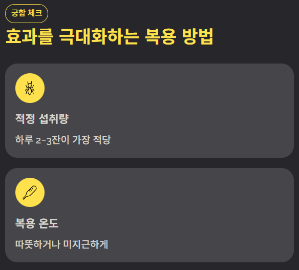 - 섭취량: 하루 2~3잔이 적당하며, 장기 복용 시에는 본인의 소화 상태를 살피며 조절하는 지혜가 필요합니다.