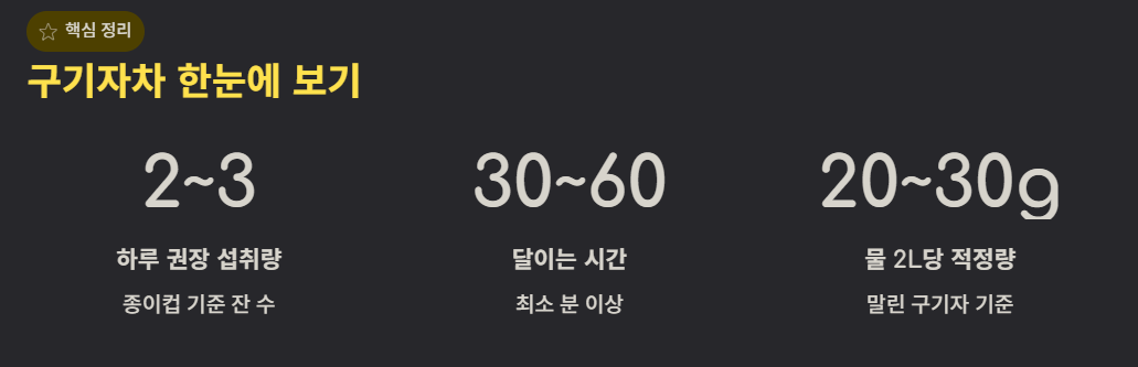- 적정 섭취량: 하루에 종이컵 기준으로 2~3잔 정도 마시는 것이 가장 적당합니다. 물 대신 연하게 끓여 수시로 마셔도 좋습니다.