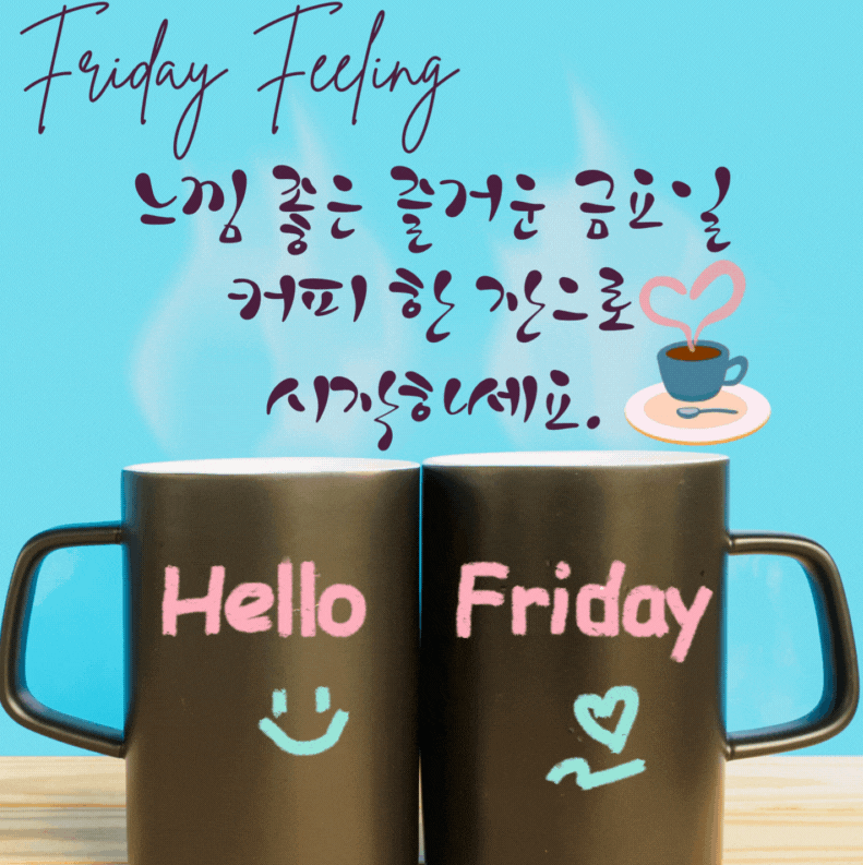 - 굿모닝 금요일! 오늘 아침 커피는 유독 더 달콤한 것 같아. 주말이 코앞이니까 우리 에너지 풀충전해서 달려보자!