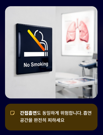 - 금연은 필수: 담배 연기는 기관지 점막을 파괴하는 가장 치명적인 적입니다. 간접흡연도 반드시 피해야 합니다.