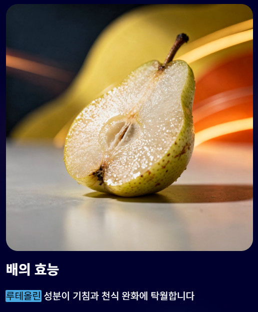- 배: '루테올린' 성분이 풍부해 기침과 천식, 기관지염 완화에 탁월합니다.