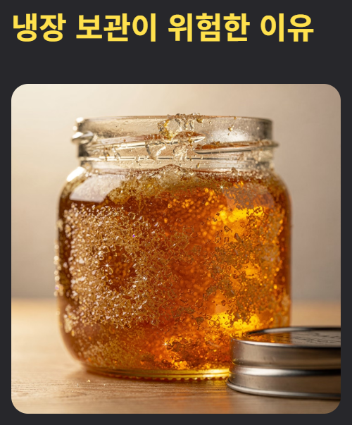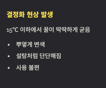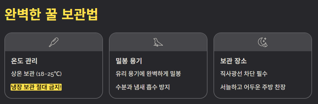 | 온도 | 상온 보관 (18~25℃) | 냉장 보관은 절대 금지! 꿀은 낮은 온도(15℃ 이하)에서 결정화되어 딱딱해지거나 뿌옇게 변합니다. 냉장 보관은 피하고 시원한 상온에 보관하세요. |