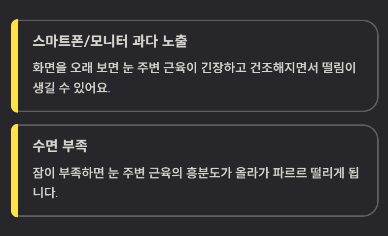 - 스마트폰 및 모니터 과다 노출: 화면을 오래 보면 눈 주변 근육이 긴장하고 건조해지면서 떨림이 생길 수 있습니다.
