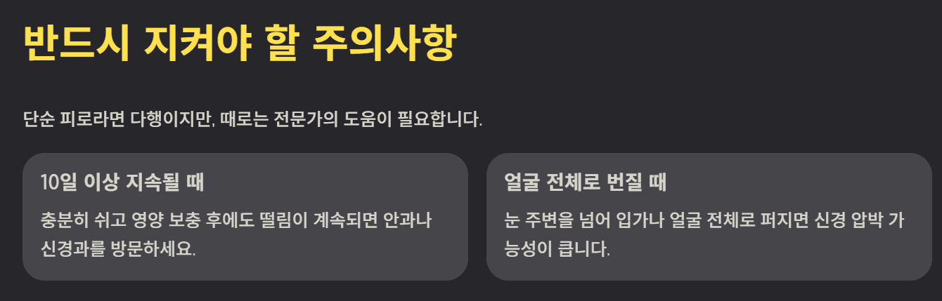 - 얼굴 전체로 번질 때: 떨림이 눈 주변을 넘어 입가나 얼굴 한쪽 전체로 퍼진다면 단순 영양 부족이 아닌 신경 압박일 가능성이 큽니다.