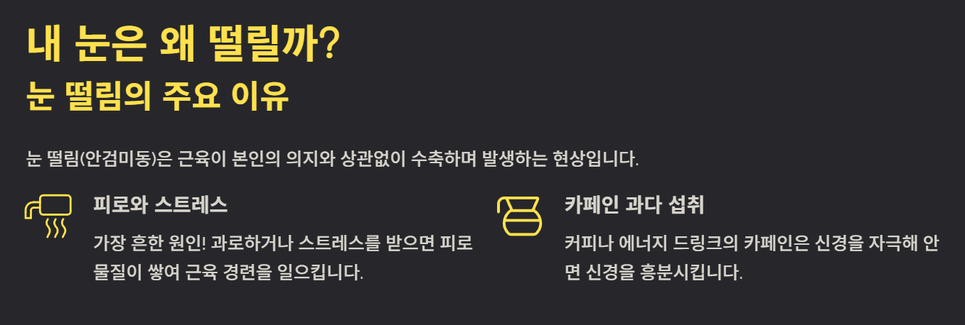 - 수면 부족: 잠이 부족하면 눈 주변 근육의 흥분도가 올라가 파르르 떨리게 됩니다.