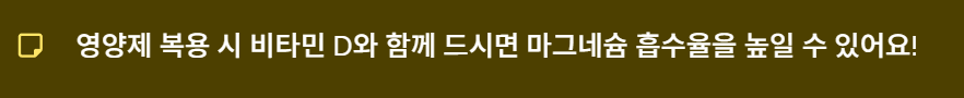 💡 섭취 팁: 영양제로 복용할 경우 비타민 D와 함께 드시면 마그네슘 흡수율을 높일 수 있습니다.