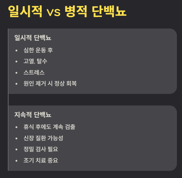 • 일시적 단백뇨: 심한 운동, 고열, 탈수, 스트레스 등 일시적인 신체 변화로 인해 나타날 수 있으며, 원인이 사라지면 정상으로 돌아옵니다.