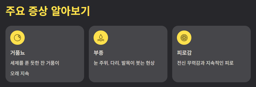 • 피로감: 신장 기능 저하와 단백질 손실로 인해 전신 무력감과 피로감이 심해집니다.