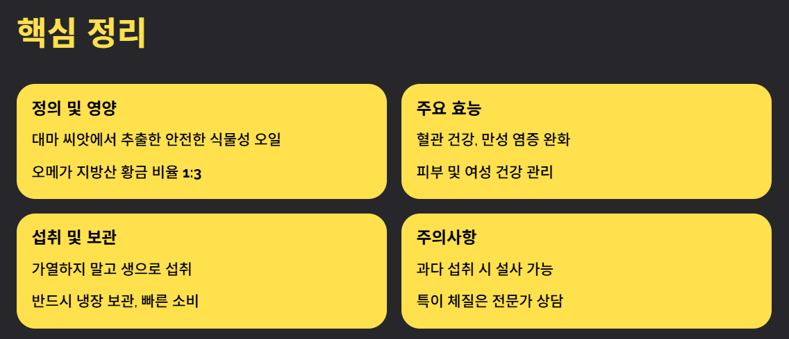 - 정의 및 영양: 대마 씨앗에서 추출한 안전한 식물성 오일로 오메가 지방산이 황금 비율(1:3)로 들어있습니다.