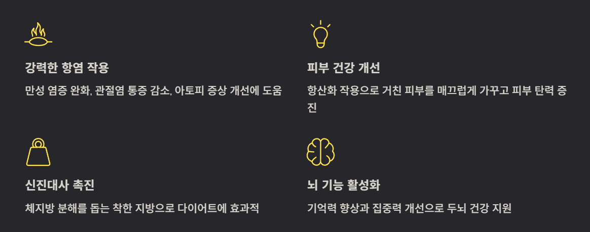 - 효능: 혈관 건강 개선, 만성 염증 완화, 피부 및 여성 건강 관리에 탁월한 효과가 있습니다.