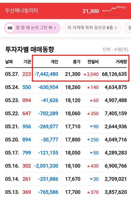 5월 27일 기준 거래량을 보면 외국인 570만주 매수, 기관 180만주 매수, 개인 740만주 매도 입니다. 외국인의 보유량이 24일 20%를 돌파하는 시점부터 이미 뉴스케일 파워 수주 소식이 나왔던것으로 보입니다.