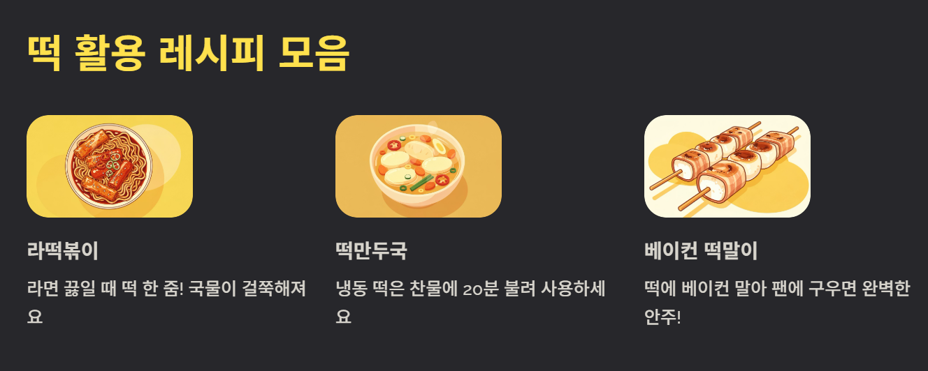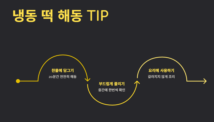 - 요리: 냉동 떡은 꼭 찬물에 불려 사용하고, 구이나 강정 등 다양한 간식으로 활용해 보세요.