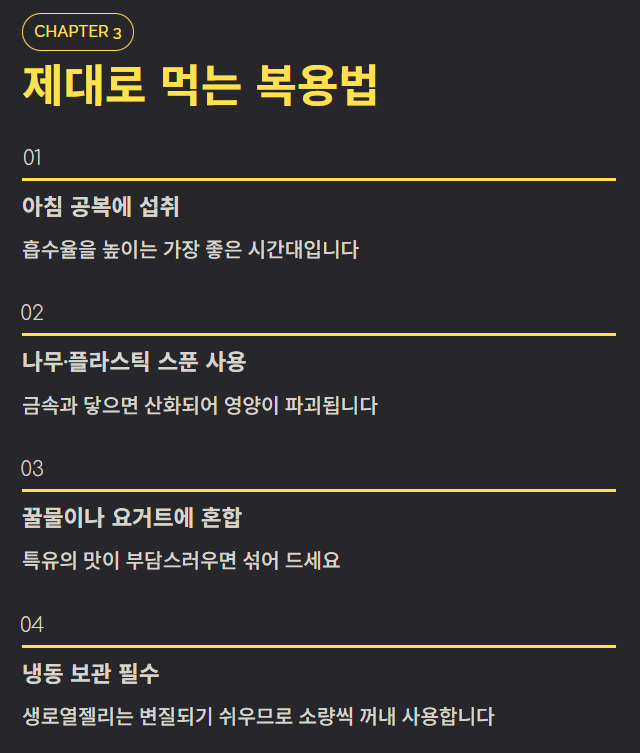 - 복용 및 보관: 공복에 나무 스푼으로 섭취하며, 생로열젤리는 반드시 냉동 보관해야 성분 파괴를 막을 수 있습니다.