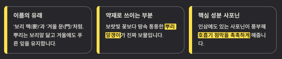 - 이름의 유래: 한자로 '보리 맥(麥)'과 '겨울 문(門)' 자를 씁니다. 뿌리가 보리알과 비슷하게 생겼고, 추운 겨울에도 잎이 죽지 않고 푸르게 살아남는다고 해서 붙여진 이름입니다.