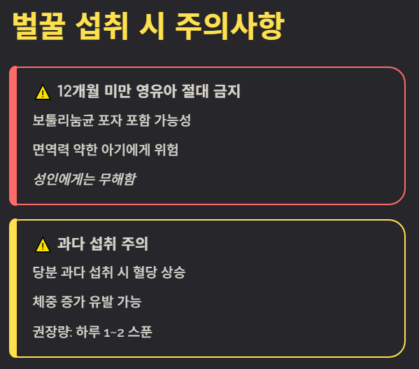 - 돌 전 영유아: 꿀에는 보툴리눔균 포자가 포함될 수 있어, 면역력이 약한 12개월 미만의 아기에게는 절대 먹이지 않아야 합니다. (성인에게는 무해함)
