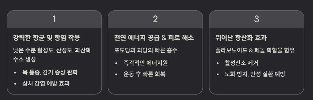 - 원리: 꿀의 낮은 수분 활성도와 산성도, 그리고 효소에 의해 생성되는 미량의 과산화수소 덕분에 강력한 천연 항균 효과를 가집니다.