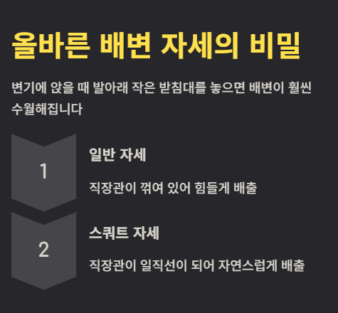 - 올바른 배변 자세: 변기에 앉을 때 발아래 작은 받침대를 놓아 무릎을 높이면(스쿼트 자세), 직장관이 일직선이 되어 변 배출이 훨씬 수월해집니다.