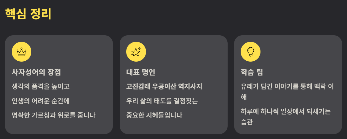 3. 학습 팁: 유래가 담긴 이야기를 통해 맥락을 이해하고, 하루에 하나씩 일상에서 되새기는 습관이 중요합니다.