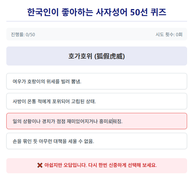 사자성어 학습은 지혜를 넓히는 좋은 방법입니다. 틀린 문제들을 복습해 보세요!