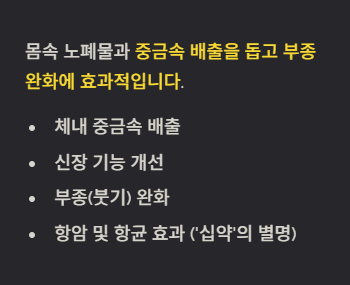 - 강력한 해독 및 이뇨 작용: 체내 쌓인 중금속을 배출하고 신장 기능을 도와 부종(몸이 붓는 증상)을 완화합니다.