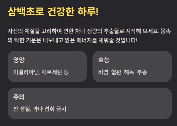 - 요약: 삼백초는 현대인의 염증과 혈관 문제를 해결해 주는 훌륭한 천연 약초입니다. 다만 자신의 체질을 고려해 연한 차나 정량의 추출물로 시작하는 것이 좋습니다.