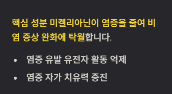 - 비염 및 호흡기 질환 개선 (미켈리아닌): 추출물의 핵심 성분인 '미켈리아닌'은 염증을 유발하는 유전자의 활동을 줄이고 스스로 염증을 가라앉히는 힘을 키워줍니다. 특히 비염 증상 개선에 큰 도움을 줍니다.