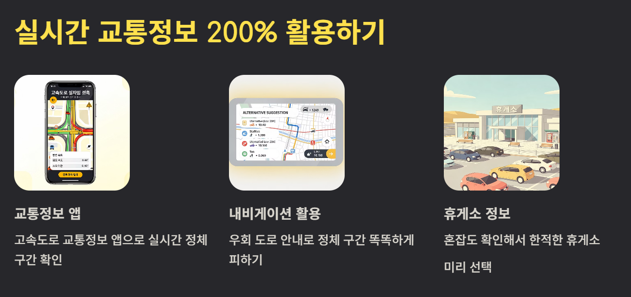 - 교통정보 앱 활용: '고속도로 교통정보(로드플러스)' 앱이나 내비게이션의 실시간 경로 안내를 적극 활용하세요. 우회 도로를 안내받는 것만으로도 정체 구간을 피할 수 있습니다.