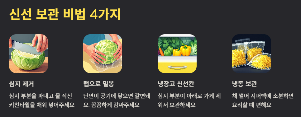 - 냉장고 신선칸 보관: 양배추는 저온 보관을 좋아합니다. 심지 부분이 아래로 가도록 해서 냉장고 신선칸에 넣어두면 보관 기간이 비약적으로 늘어납니다.