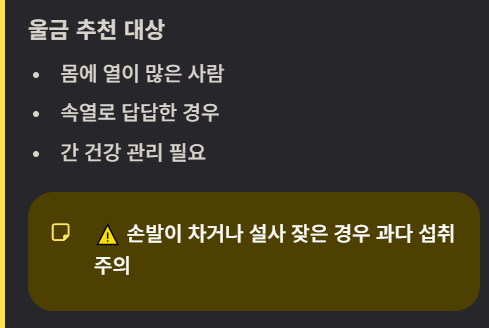 - 울금 (차가움): 몸에 열이 많아 쉽게 건조해지거나 속열이 많은 사람에게 좋지만, 평소 손발이 차거나 설사를 자주 하는 사람은 과다 섭취를 피해야 합니다.