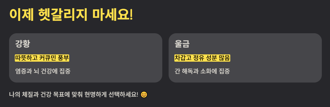 - 강황: 따뜻하고, 커큐민이 많아 염증과 뇌 건강에 집중!