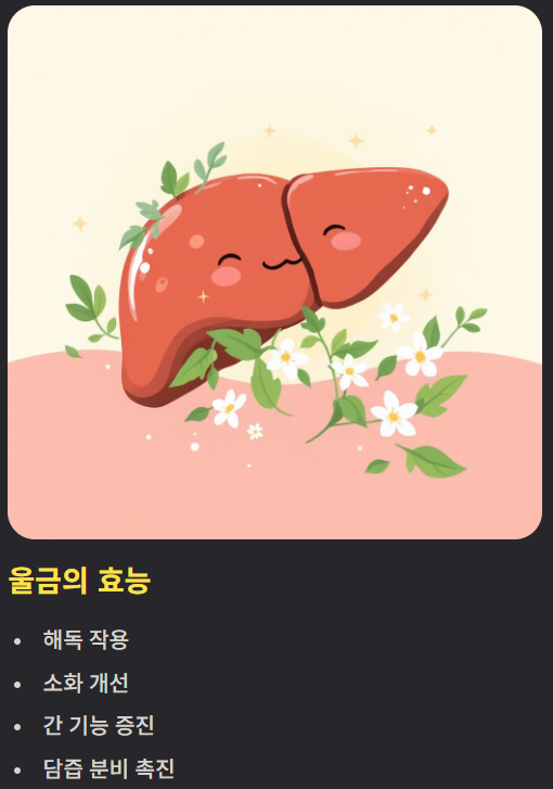 - 울금: 차갑고, 정유 성분이 많아 간 해독과 소화에 집중!