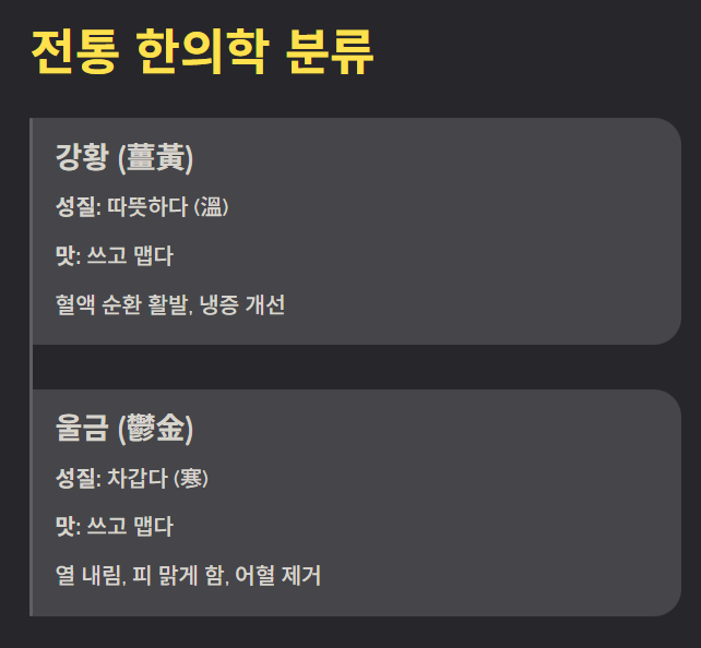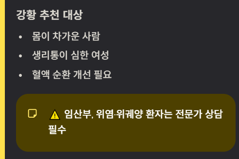 - 강황 (따뜻함): 몸이 차거나 생리통이 심한 여성에게 좋지만, 임산부나 위염, 위궤양이 심한 분은 전문가와 상의해야 합니다.