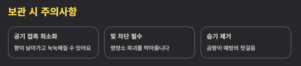 - 울금 가루 보관: 가장 흔히 쓰는 가루 형태는 공기와 접촉하면 향이 날아가고 눅눅해질 수 있습니다. 차광이 되는 밀폐 용기에 담아 직사광선이 들지 않는 서늘한 곳이나 냉장고에 보관하는 것이 가장 좋습니다. 가루 양이 많다면 소분해서 냉동실에 넣어두고 쓰시면 훨씬 오래 신선하게 즐기실 수 있습니다.