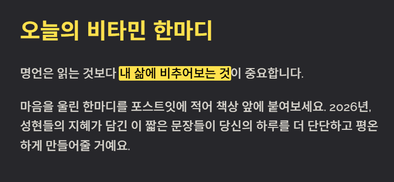 성현들의 지혜가 담긴 이 짧은 문장들이 2026년을 살아가는 여러분의 하루를 조금 더 단단하고 평온하게 만들어주길 바랍니다.