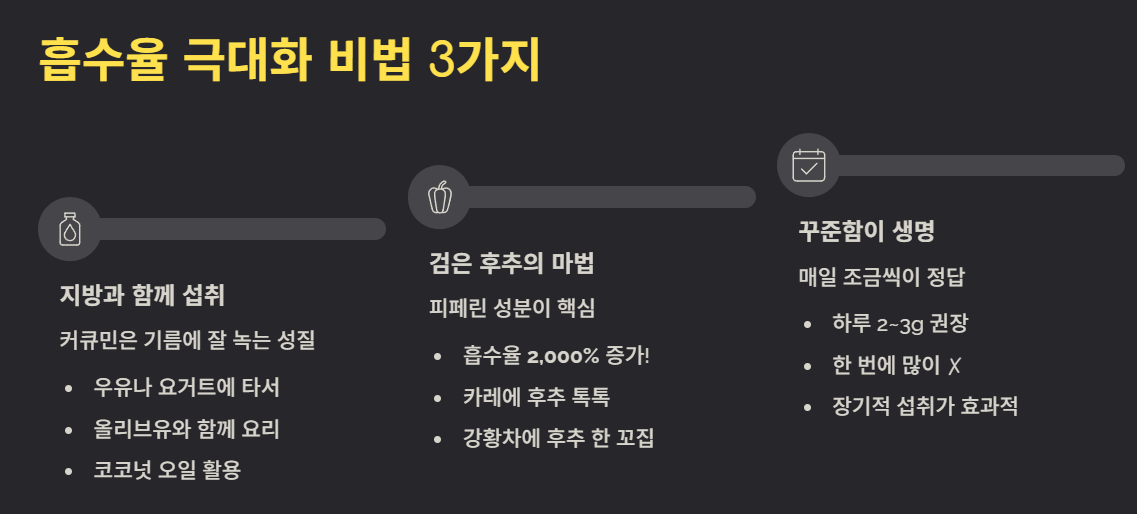 - 복용법: 체내 흡수를 돕기 위해 반드시 지방(우유, 기름) 및 후추와 함께 섭취하세요.