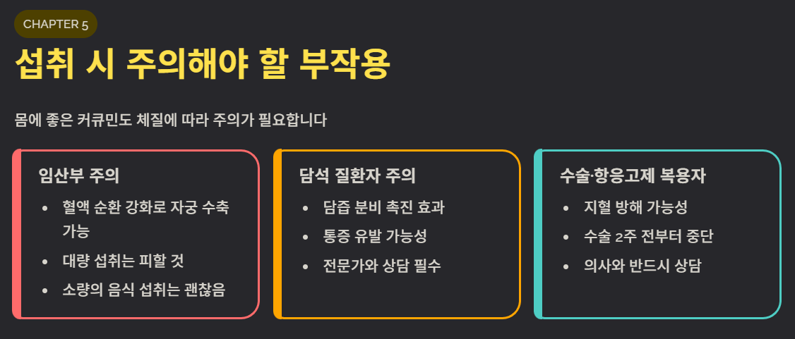 우선, 임산부는 주의해야 합니다. 커큐민은 혈액 순환을 강하게 돕고 자궁 수축을 유발할 수 있어 대량 섭취는 피하는 것이 좋습니다. 또한, 담석이 있는 분들은 담즙 분비를 촉진하는 커큐민이 통증을 일으킬 수 있으니 전문가와 상의해야 합니다.