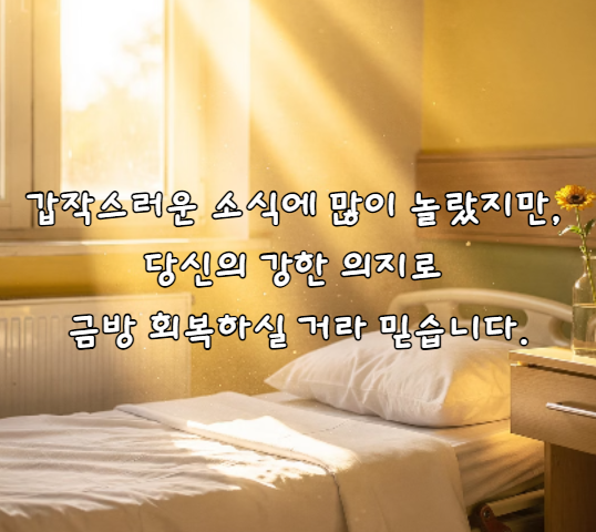 - 위로의 가치: 따뜻한 쾌유 글귀는 환자의 심리적 고립감을 줄이고 긍정적인 호르몬 분비를 도와 실제 회복을 앞당깁니다.