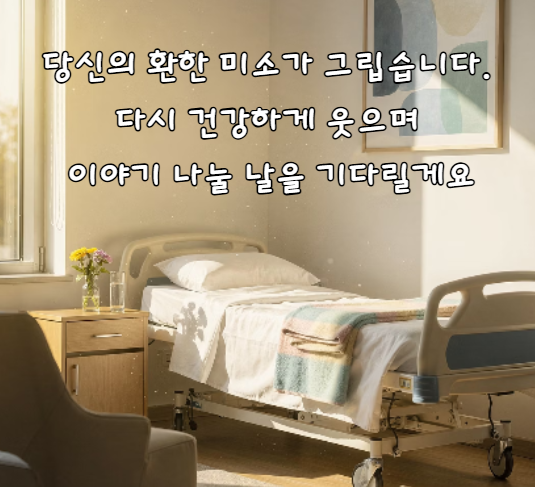 - 진심 담긴 작은 선물: 환자가 평소 좋아하던 책이나 향이 강하지 않은 꽃, 부드러운 간식(식이 제한이 없는 경우)을 짧은 카드와 함께 전달하면 회복 의지를 높이는 데 큰 도움이 됩니다.