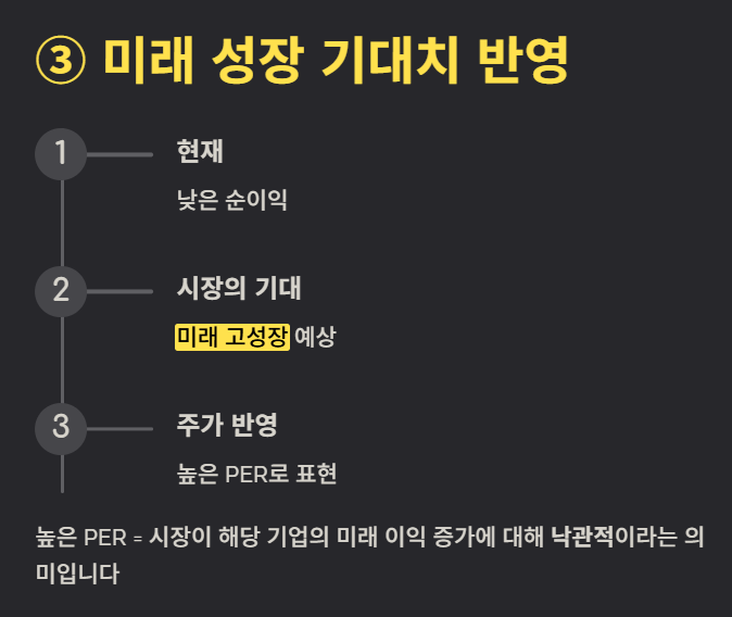 • 높은 PER의 의미: 투자자들이 해당 기업이 현재보다 미래에 훨씬 더 많은 이익을 벌어들일 것이라고 기대하고 있다는 의미입니다. (미래 가치를 현재 주가에 미리 반영)