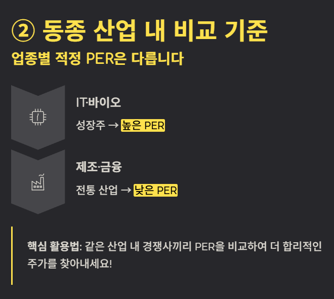 • 산업 비교의 중요성: 반드시 같은 산업군 내에서 비교해야 의미가 있습니다. 전혀 다른 산업 간의 PER 비교는 무의미합니다.