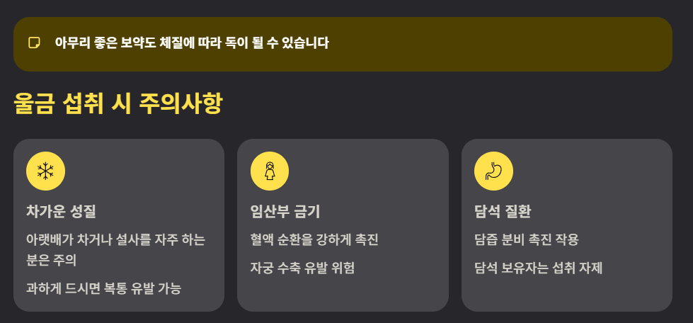 또한, 울금은 혈액 순환을 강하게 돕는 성질이 있어 임산부에게는 권장하지 않습니다. 자궁 수축을 유발할 수 있기 때문이죠. 담석이 있는 분들도 담즙 분비를 촉진하는 울금이 부담될 수 있으니 주의가 필요합니다.
