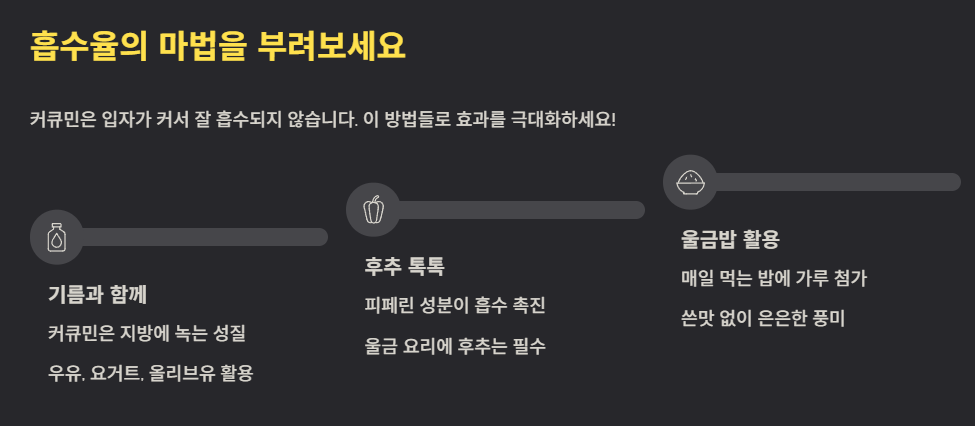 - 기름(지방)과 함께: 커큐민은 기름에 녹는 성질이 있습니다. 우유나 요거트에 타서 마시거나, 요리할 때 올리브유 같은 기름을 곁들이면 흡수율이 훨씬 올라갑니다.