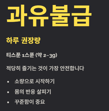 뭐든지 과유불급! 하루 권장량인 티스푼으로 한 스푼(약 2~3g) 정도를 넘지 않게 적당히 즐기는 것이 가장 안전합니다.